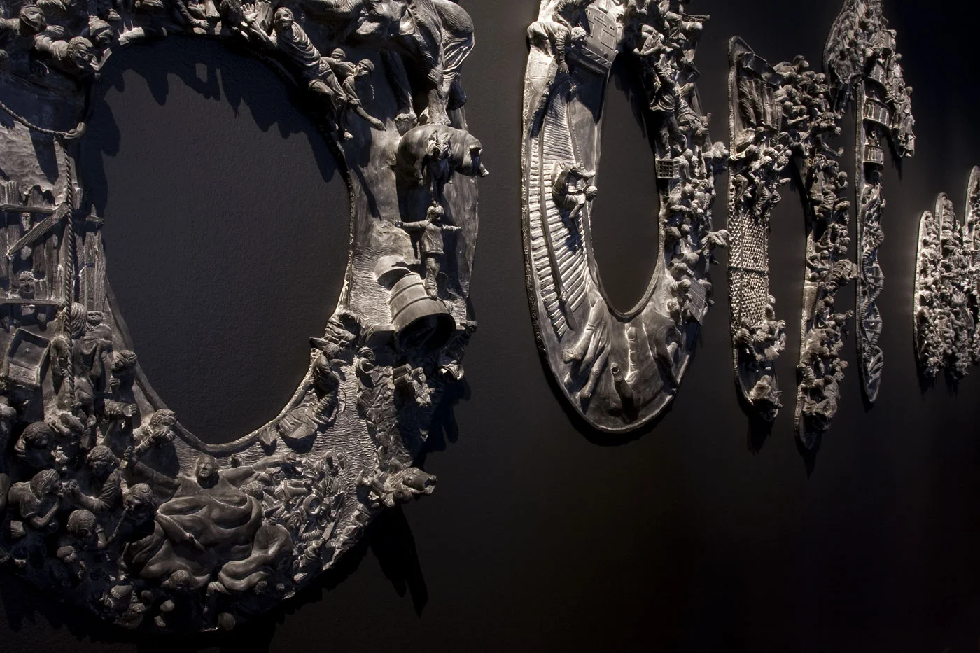 Here is a relief panel, the first of nine, in which different narratives co-exist in a tense, occasionally mocking way, invading each other and scrambling each other up—a trunk of an elephant becomes a mega-phallus, while Miracle Mike makes a nuisance of himself under the feet of anguished, cataclysmic figures. You can do what you want with dontworry — it’s a free country and all. But if you look hard at every bit of it, it’ll look back at you. Decipher, decode, read between the lines just as Dante wanted the readers of The Divine Comedy to do (I am thinking a lot about The Divine Comedy when I stand in front of dontworry). Look till your eyes roll back. Whatever you do with it, it won’t dry up on you.